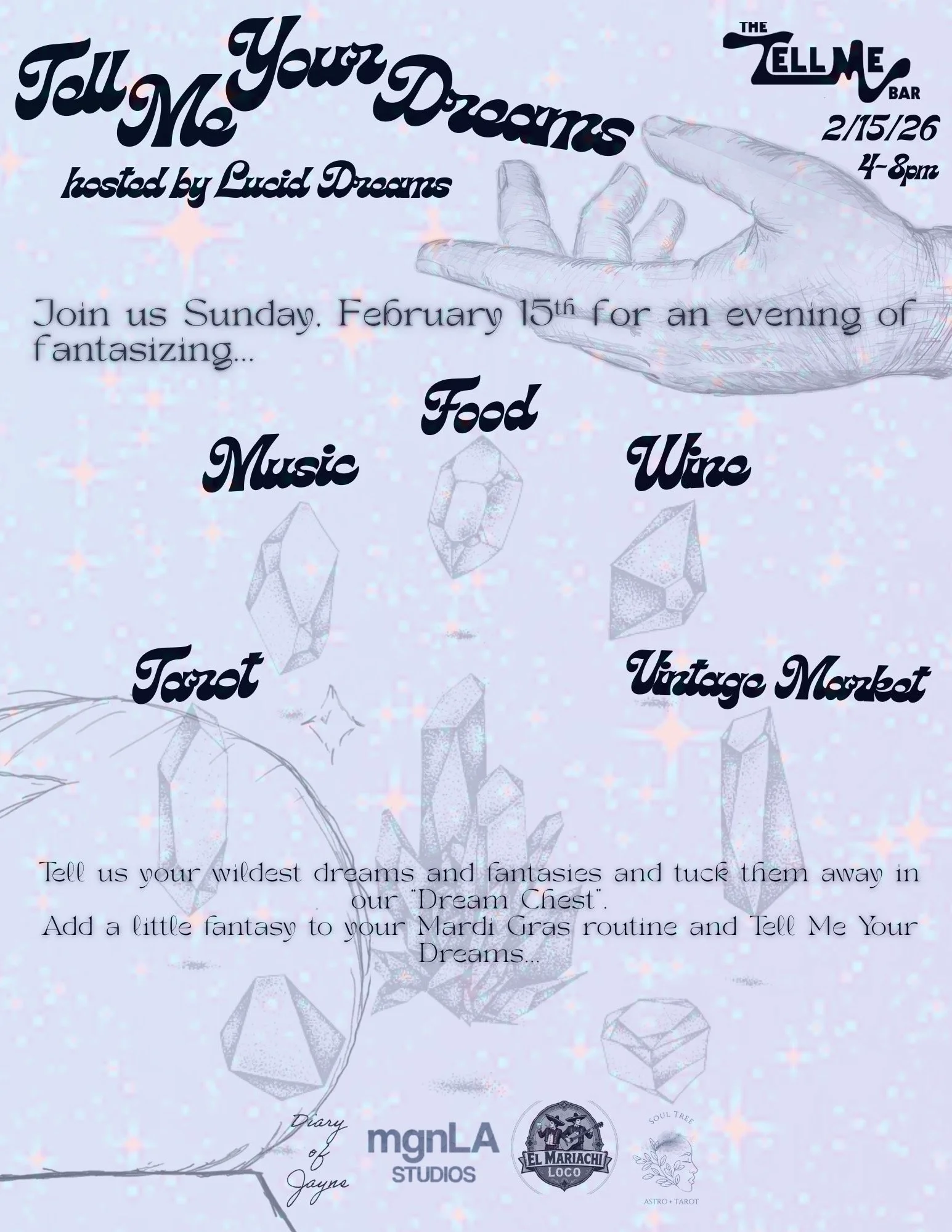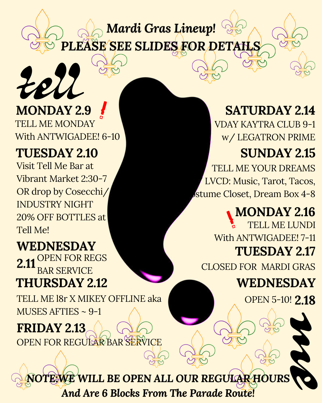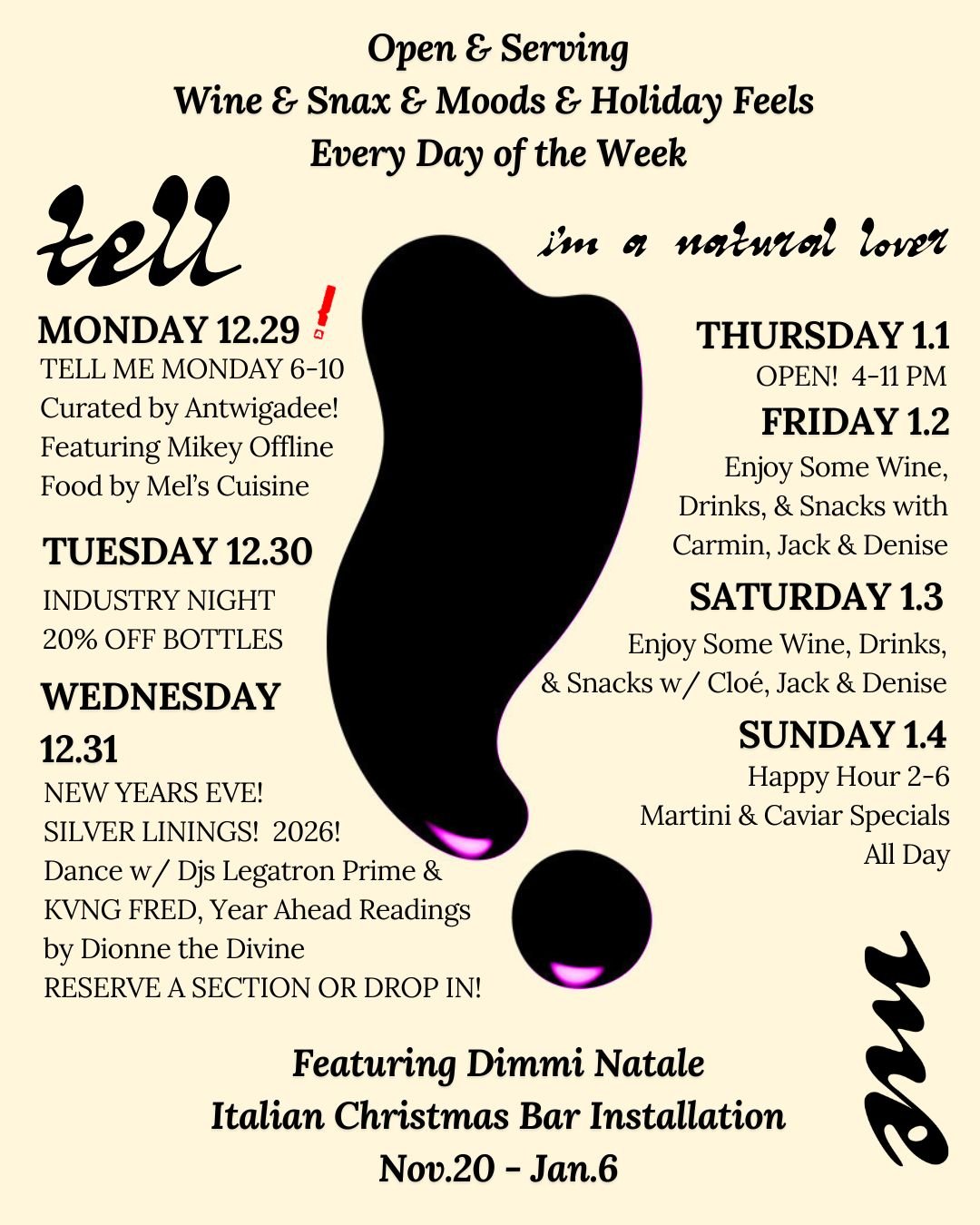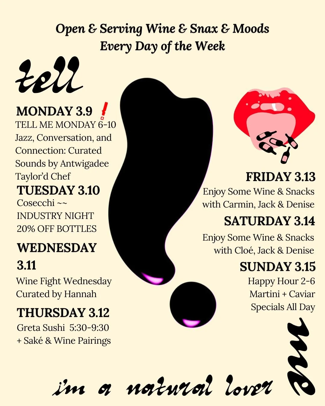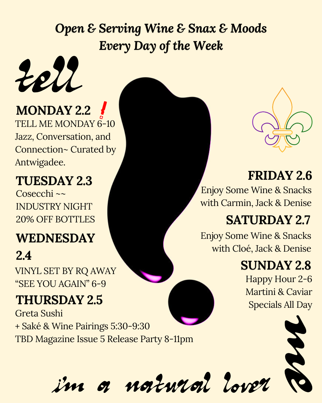 THE TELL ME BAR is a natural wine bar located in the Lower Garden District, walking distance from The Superdome and WWII Museum. We have an intimate, relaxed atmosphere with a tropical mid-century Italian design theme and a large outdoor patio. We feature an extensive, meticulously curated wine list and snack plates of cheese, charcuterie, conservas & caviar.